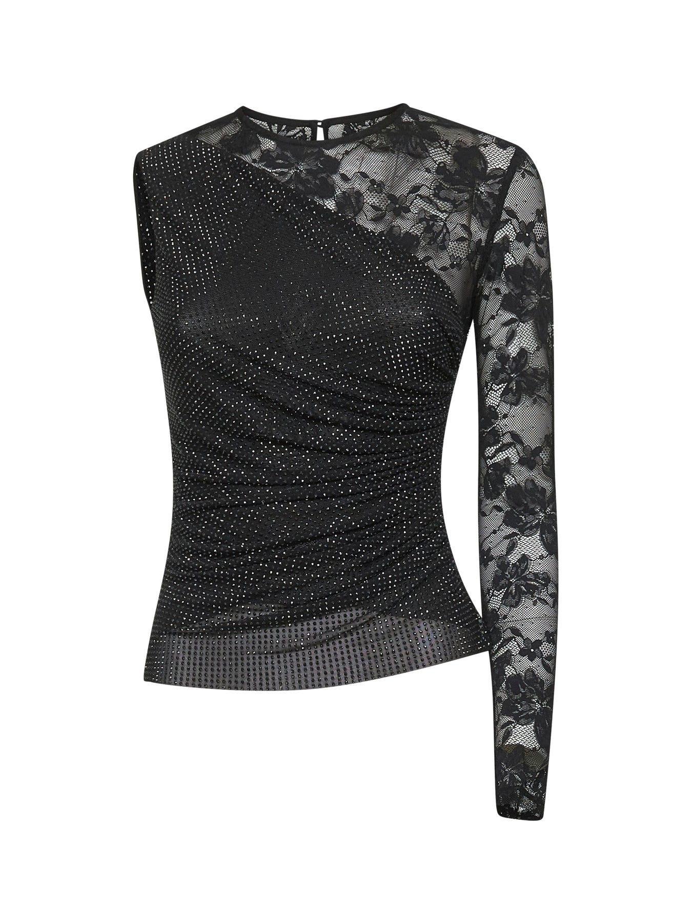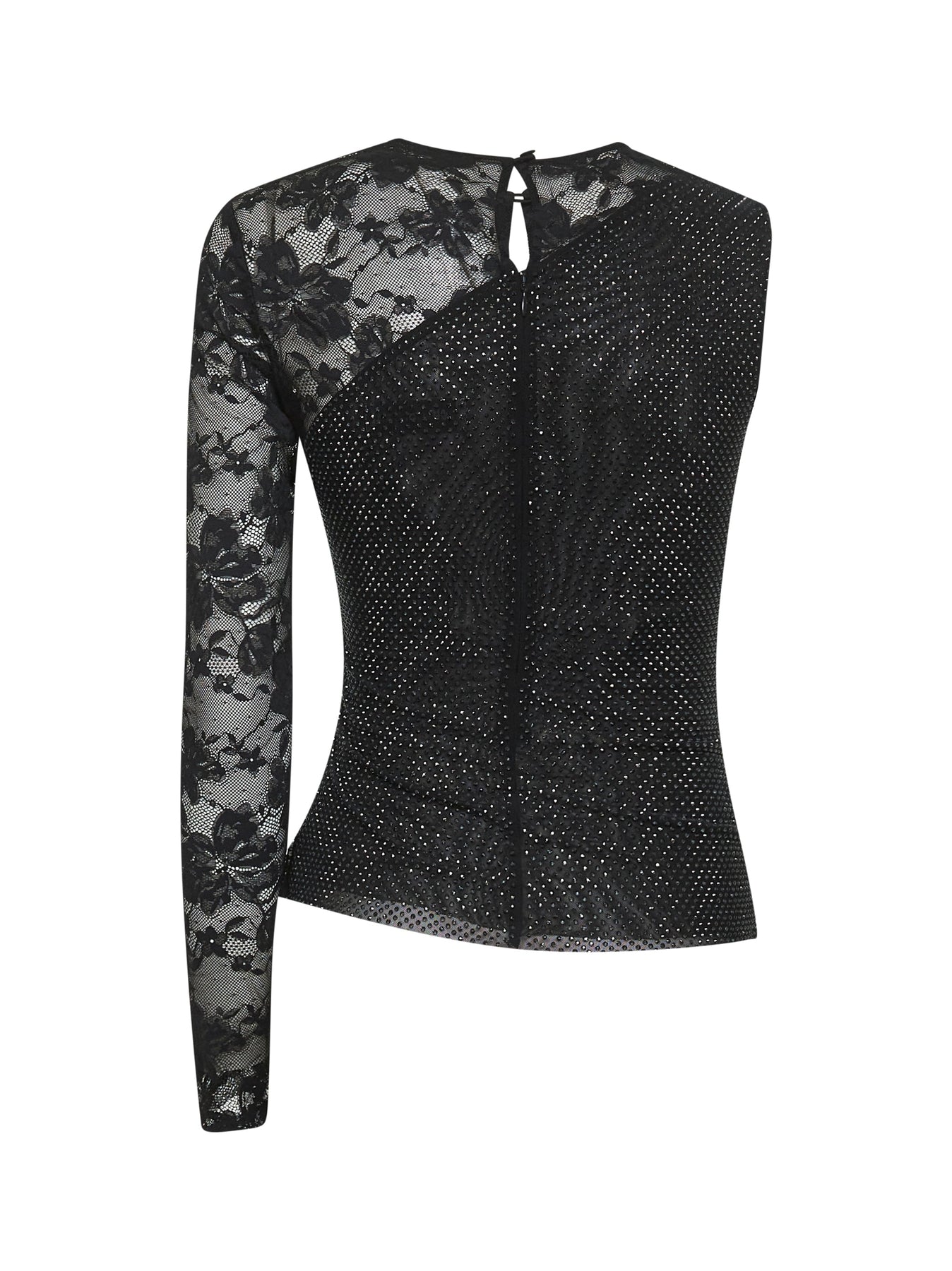 •Invisible back zip closure; button closure at neck back with keyhole cut-out •Crewneck •Asymmetric lace long sleeve •Side gathered detailing; draped waist •Rhinestone-studded mesh design with tone-on-tone floral lace panel •Fitted fit •Black color •95% Polyester, 5% Elastane •Made in Extra EU