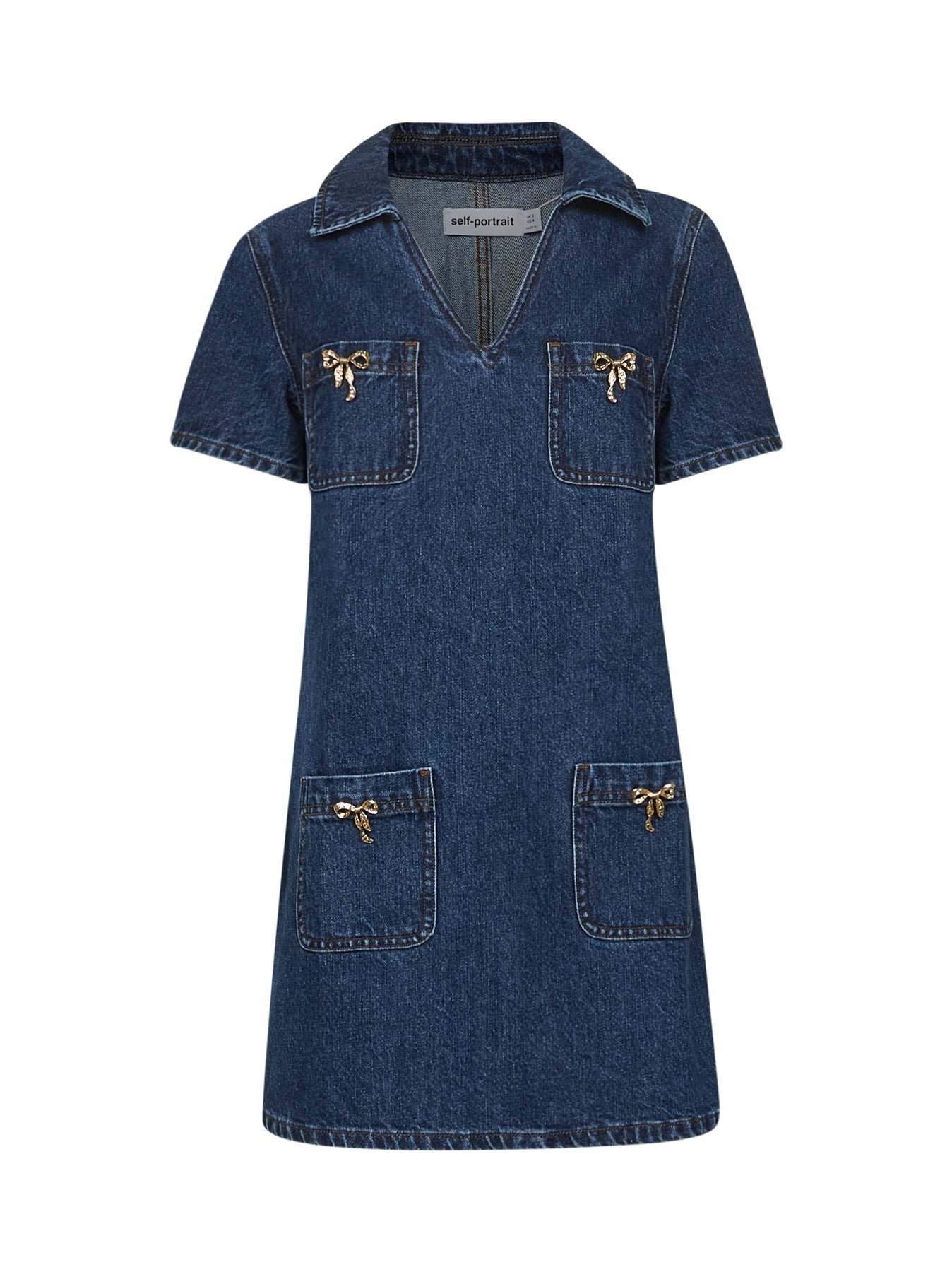 Self Portrait Women Blue Denim Gold Bow Mini Dress