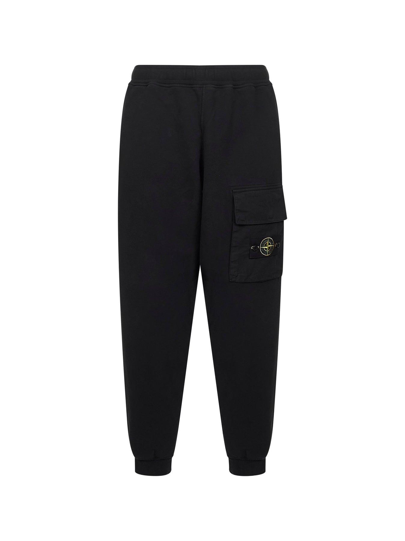 •Elasticated waistband •Side pockets, back welt pocket with covered snap button closure, patch pocket at left leg with covered snap-buttoned flap; Stone Island badge at pocket •Elasticated ribbed cuffs at the ankles •Tapered leg •Regular fit •Black color •100% Cotton •Made in Romania