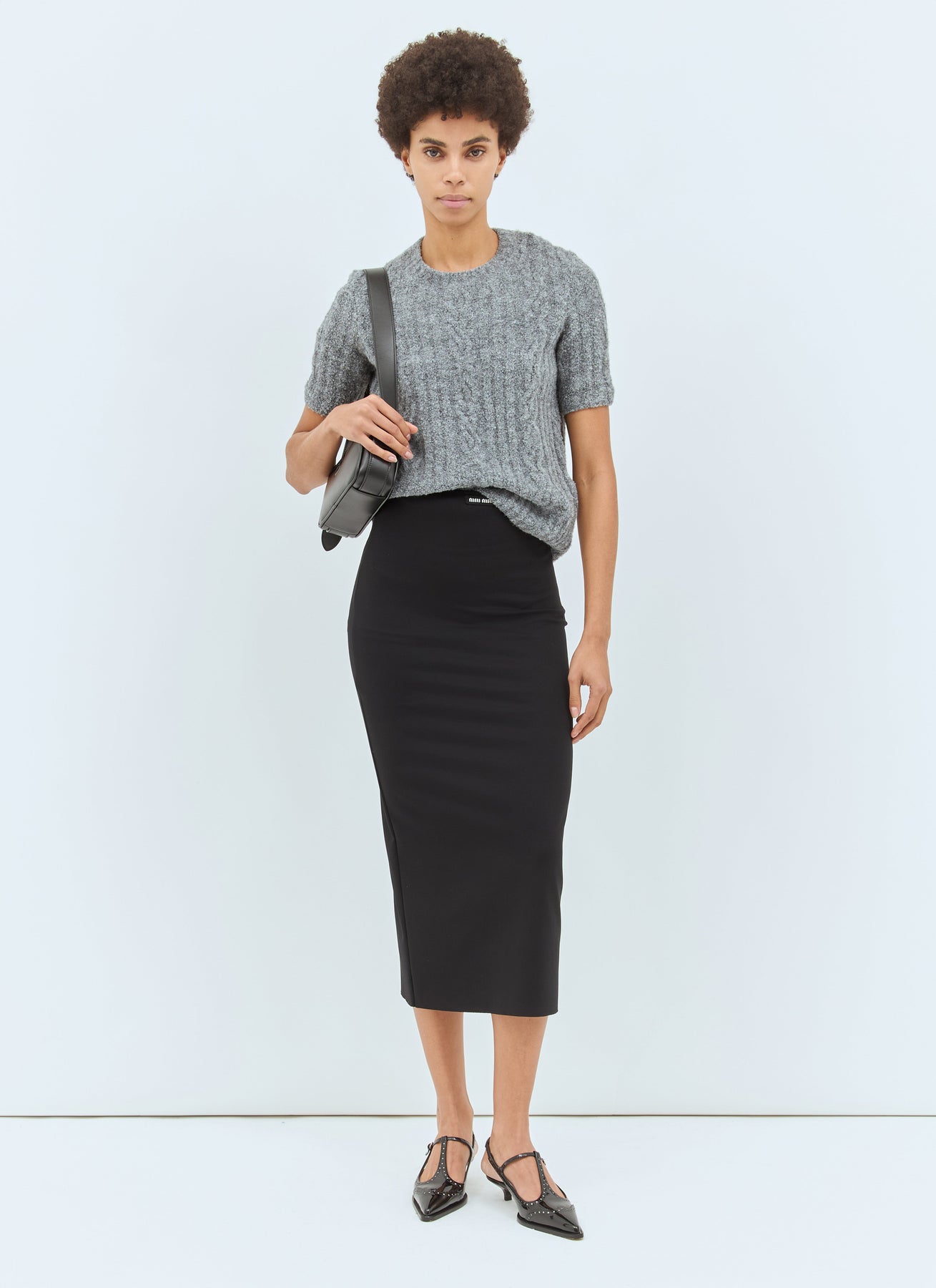 Woman in designer skirt and holding white box purse
