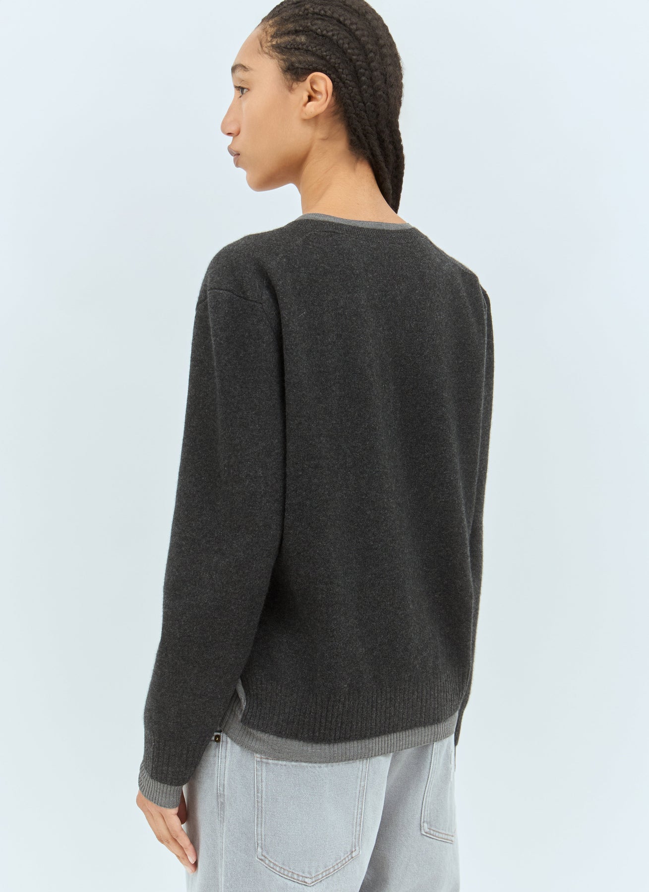 Wool sweater with double neckline construction.