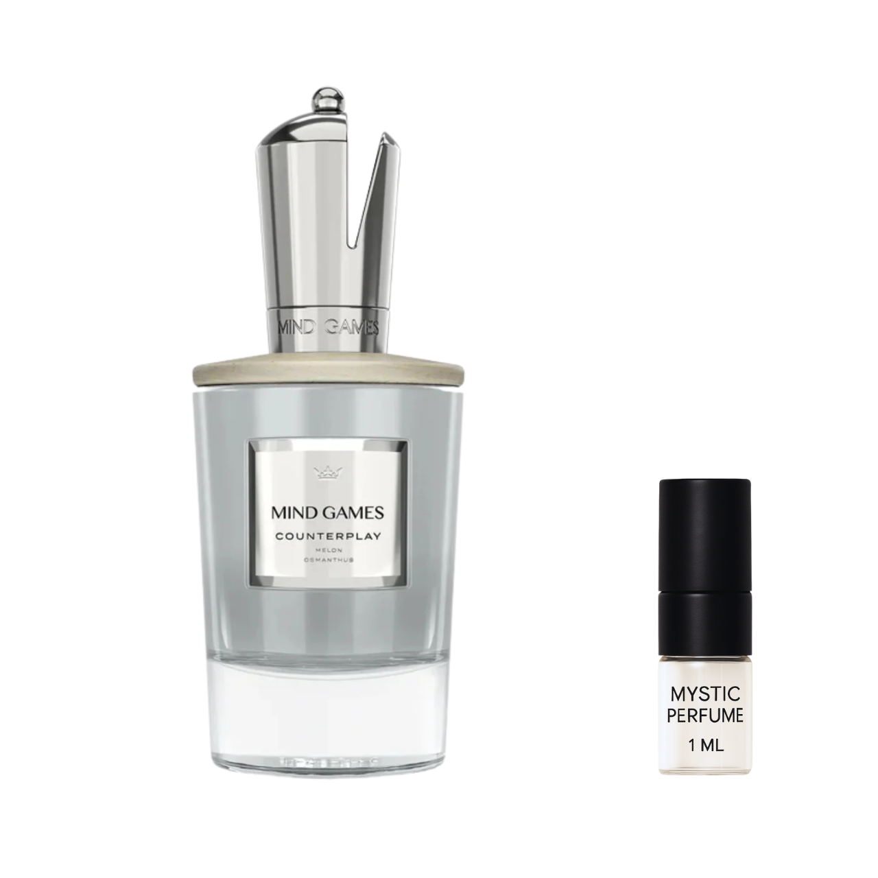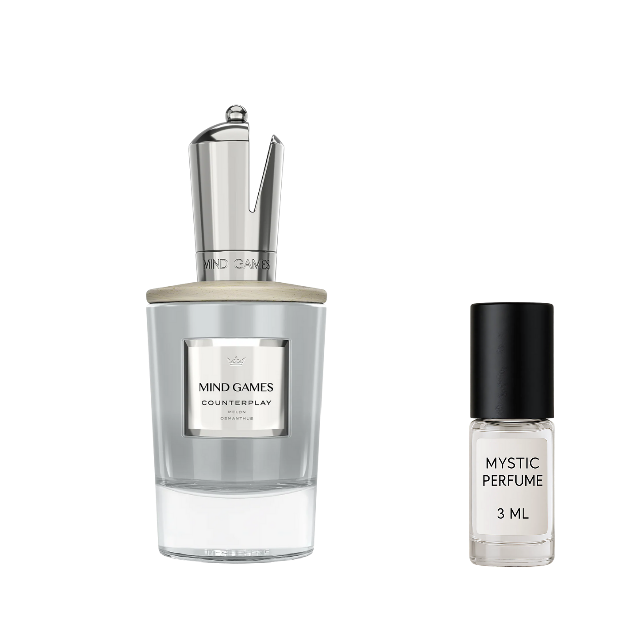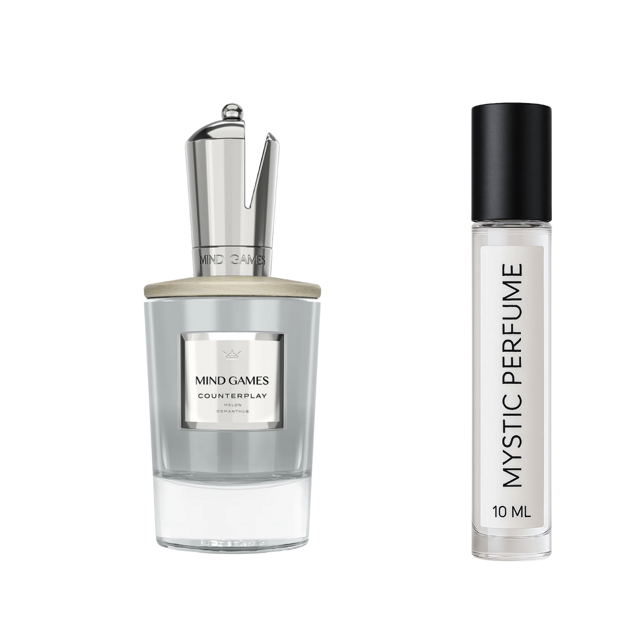 Counterplay by Mind Games is a woody fruity floral fragrance inspired by the juicy brightness of a perfectly ripe cantaloupe on a sunlit summer afternoon. Bursting with melon, guava, and banana, the scent evolves into a velvety heart of osmanthus, ylang-ylang, and orange blossom, before drying down into a smooth and modern base of sandalwood, patchouli, and a dash of pink pepper.