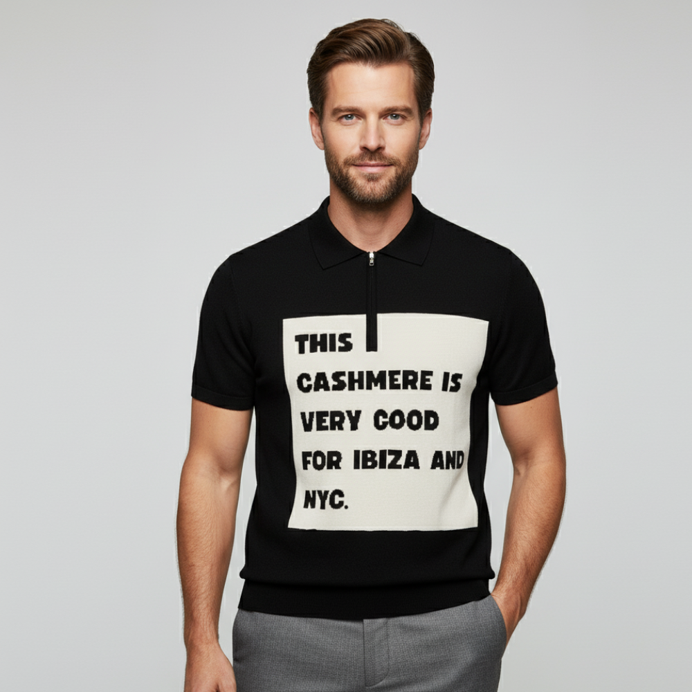 We present the IBIZA NIGHTS Cashmere Polo, the garment that redefines casual luxury with a message that crosses continents. This short-sleeved polo with a half-zip closure features an elegant color-block design in deep black and a central off-white panel, serving as the canvas for the original and witty BYMANYC® New York phrase: "THIS CASHMERE IS VERY GOOD FOR IBIZA AND NYC."