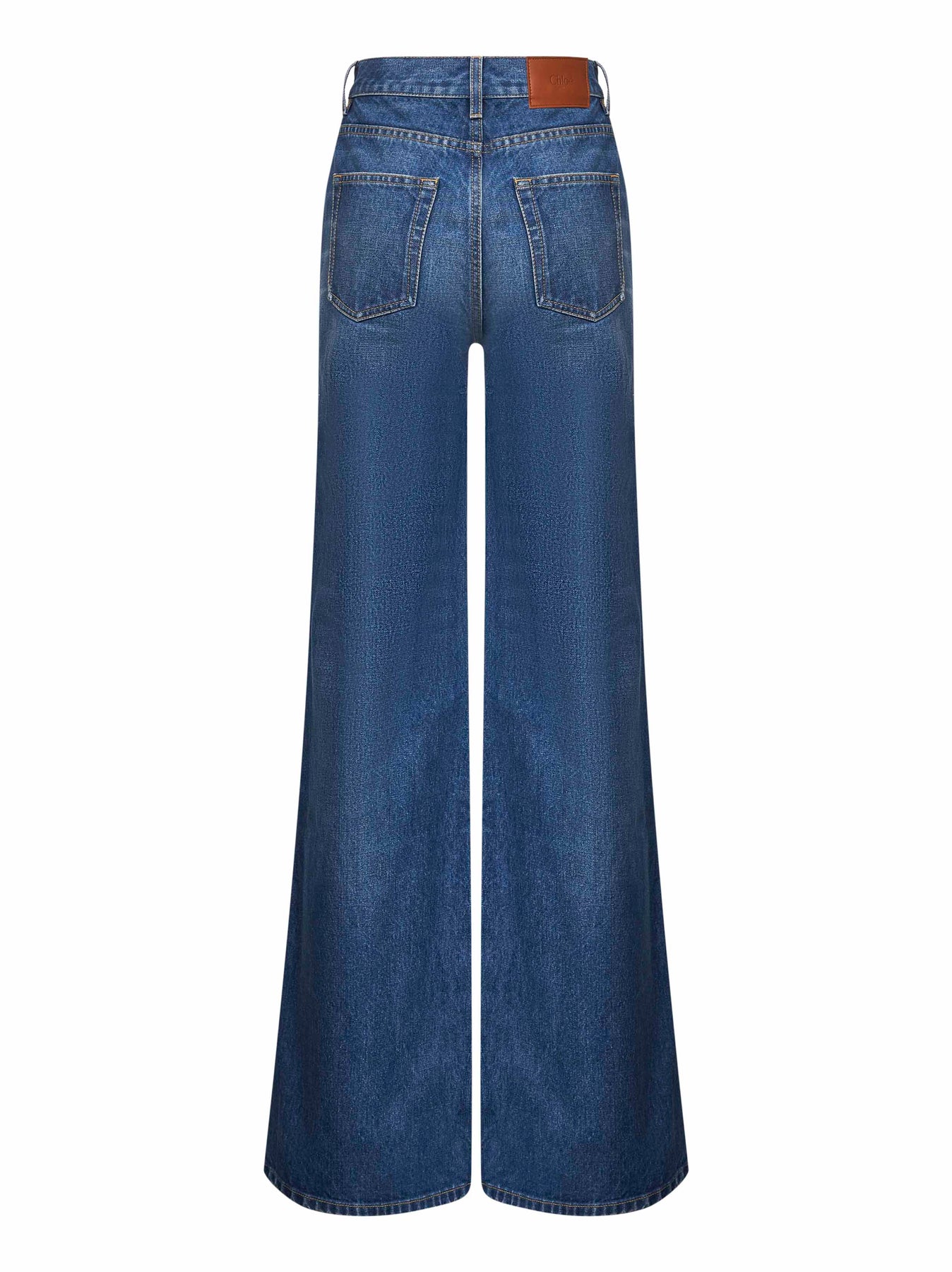 •Front zip fly closure, Chloé engraved button •High waist with belt loops •Five pocket model •Leather Chloé patch at back waistband •Blue broken organic cotton denim design •Flared fit •Blue color •100% Cotton •Made in Italy