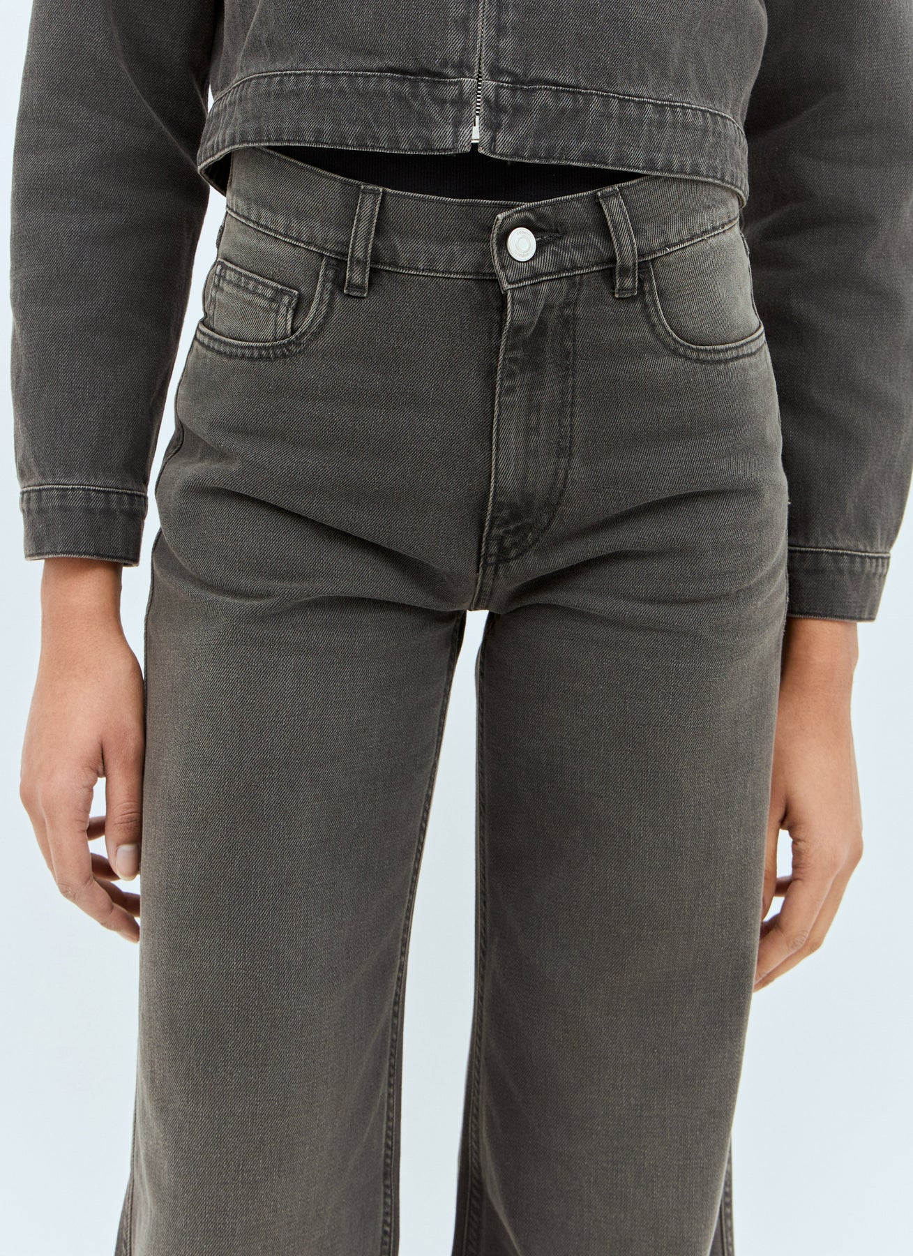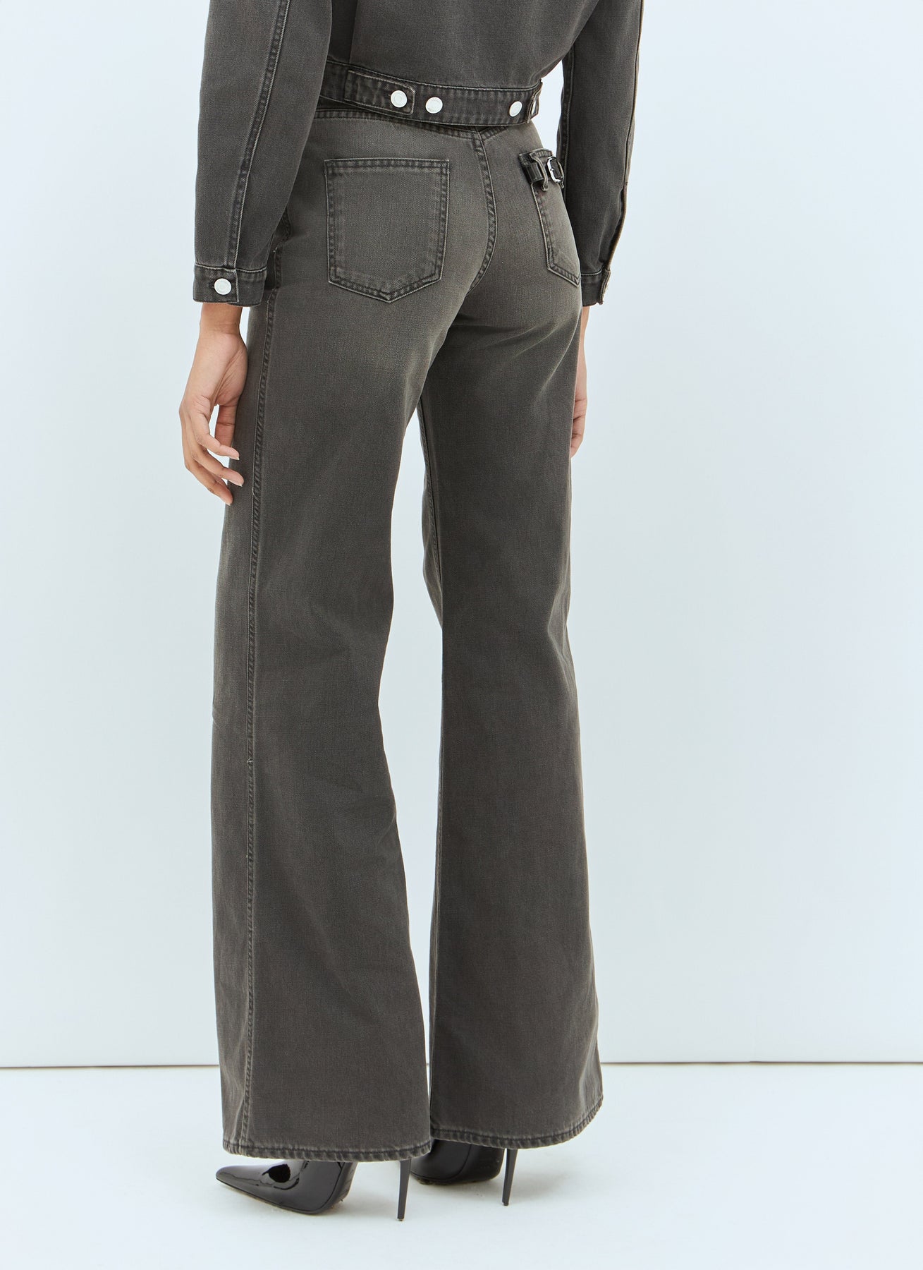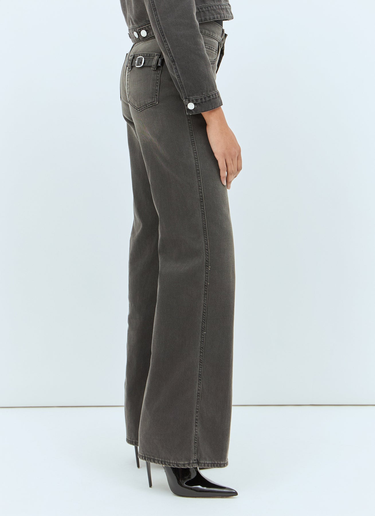 Wide-leg jeans with belted pocket at rear.