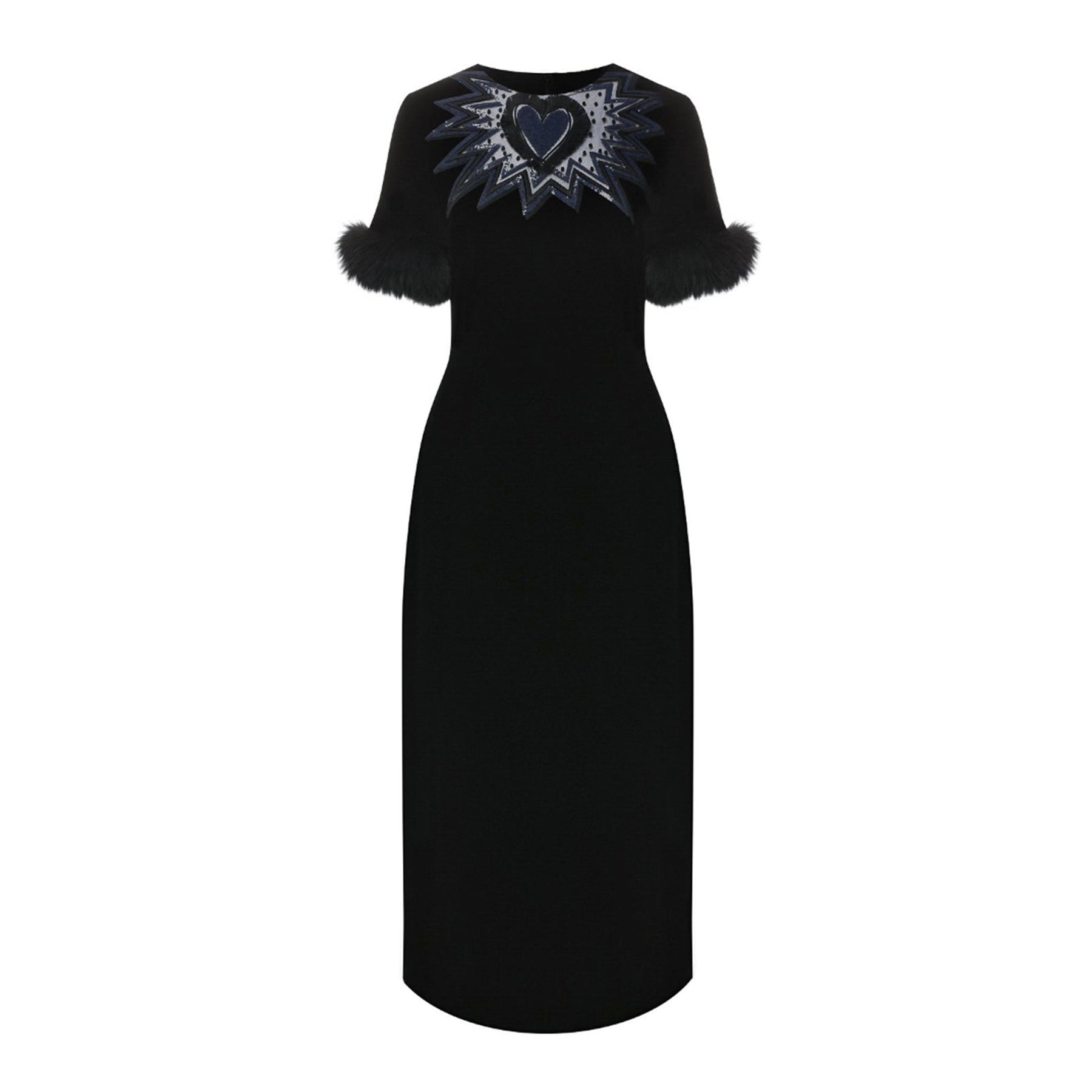 - Composition: 92% Viscose 18% Silk - Fox fur trim - Short sleeves - Paillettes detail - Concealed back zip fastening - Fully lined - Regular fit - Model is 1.78m wearing size 42 - Made in Italy - MPN FD9653_A3MT_F0G - Gender: WOMEN - Code: DRS FD 2 00 00 N89 W2 T