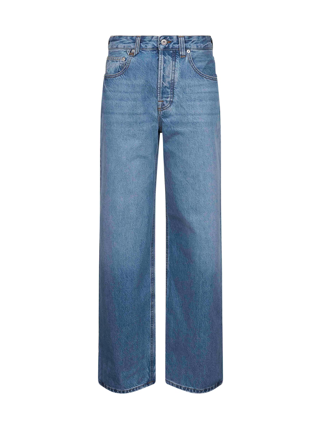 •Covered front fastening, engraved logo metal button •High-rise waist with belt loops; "J" loop at front •Five pocket model •Embroidered denim patch at back waistband •Laser-printed Jacquemus logo at back pocket •Wide leg •Washed denim design •Oversized fit •Light blue color •100% Cotton •Made in Italy