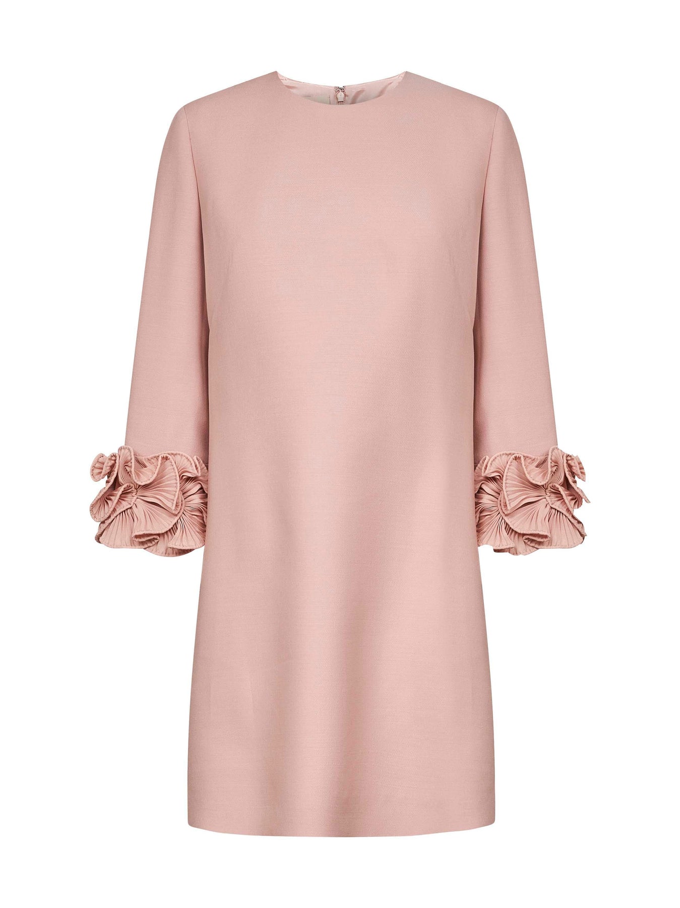 •Invisible back zip closure •Crewneck •Three-quarter sleeves; tone-on-tone georgette pleated ruffles at sleeves bottom •Silk habotai lining •Length: 90 cm (from the shoulder for size IT 40) •Flared fit •Pink color •65% Virgin Wool, 35% Silk •Made in Italy