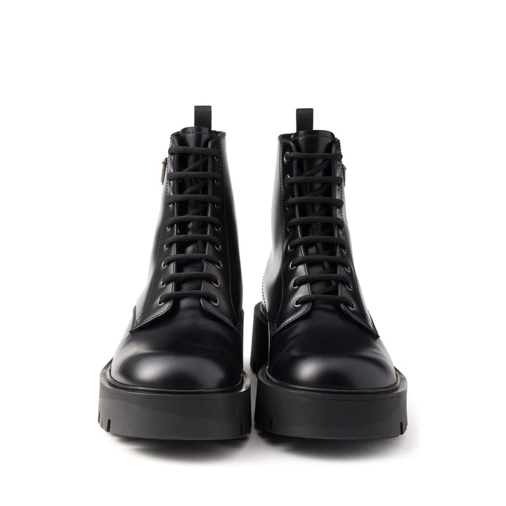 black leather smooth grain matte finish enamel triangle logo front lace-up fastening chunky rubber lug sole pull-tab at the heel leather insole