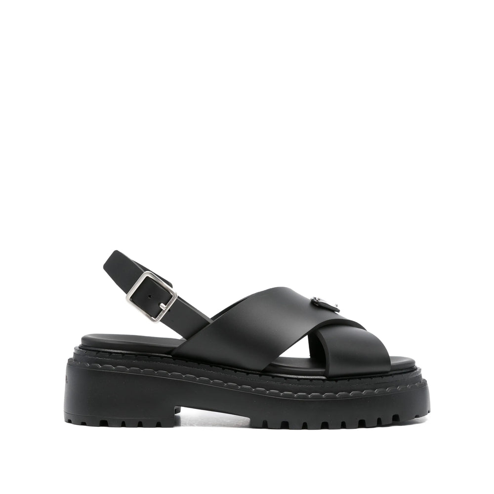 black platform sole slingback design buckle fastening cross-strap detail logo plaque