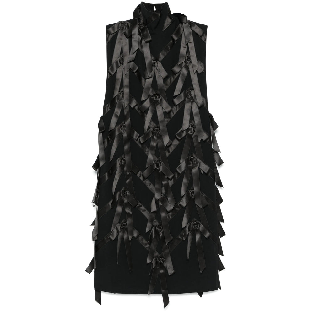 black crepe texture panelled design bow appliqué detailing rear button fastening stand-up collar sleeveless adjustable strap to the rear full lining straight hem mid-length