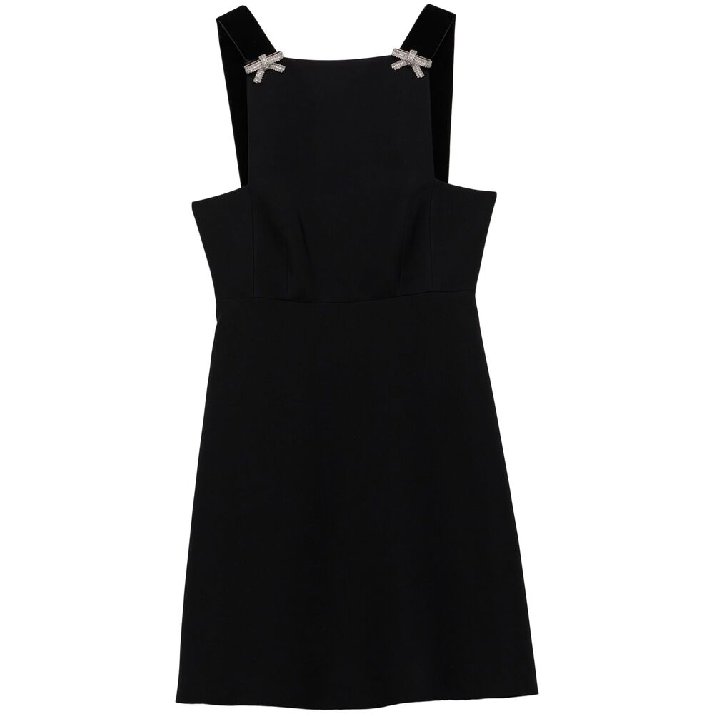 black cady texture concealed rear zip fastening square neck bow detailing crystal embellishment sleeveless open back slight flare straight hem thigh-length