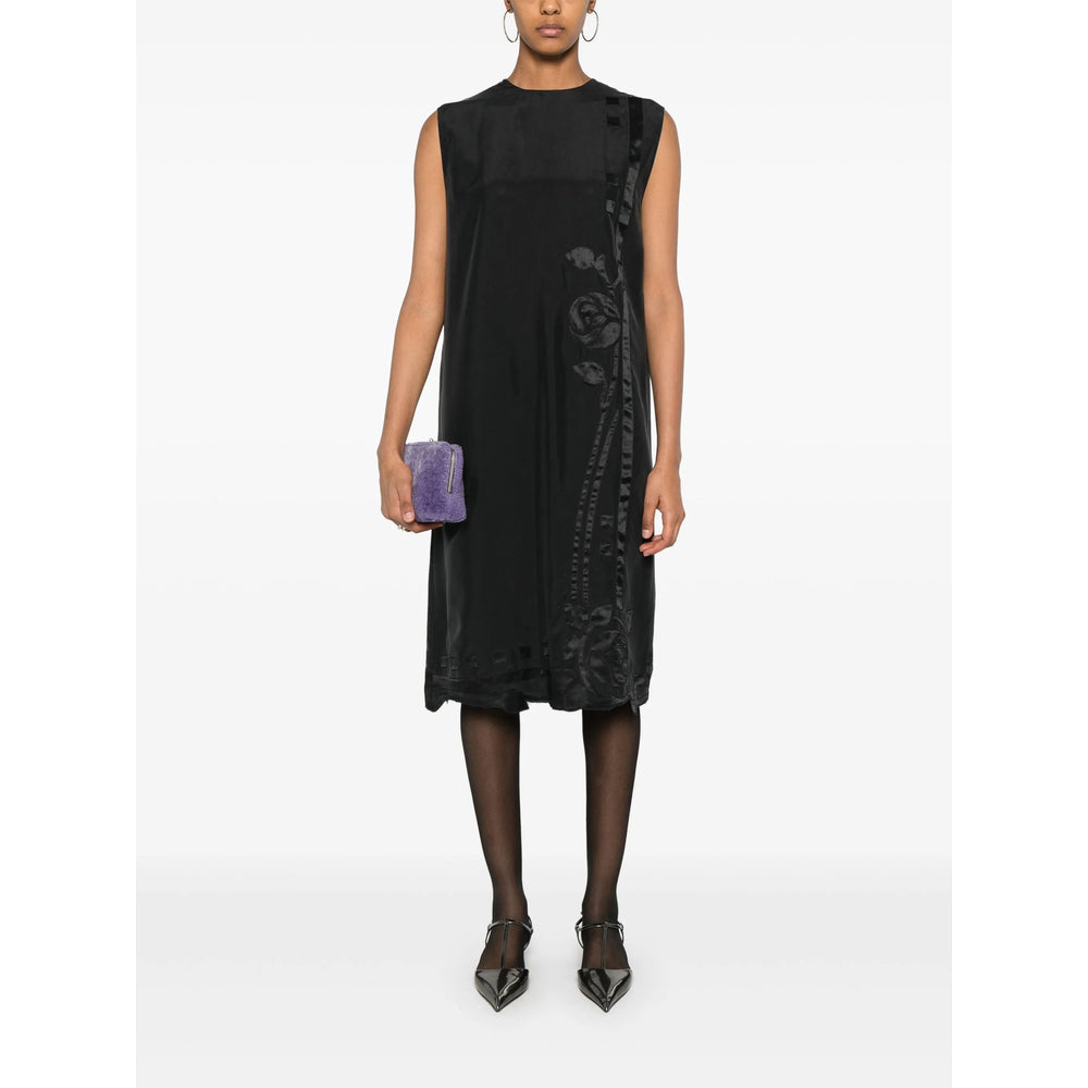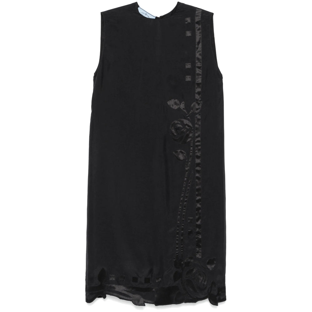 black silk satin finish floral appliqué single rear button fastening round neck sleeveless asymmetric hem mid-length