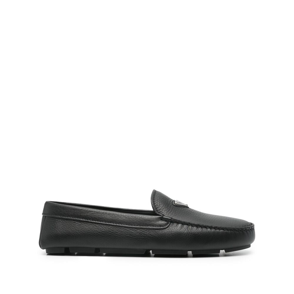 black calf leather grained texture enamel triangle logo branded insole rubber sole slip-on style