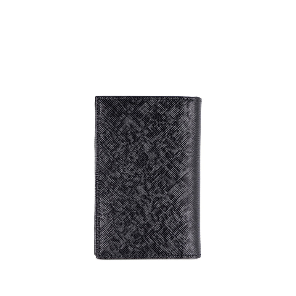 black calf leather pebbled texture bi-fold design rectangle body enamel triangle logo internal card slots