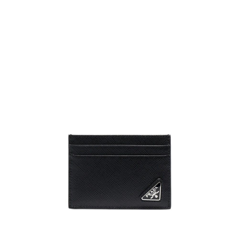 black calf leather enamel triangle logo four exterior card slots central pocket