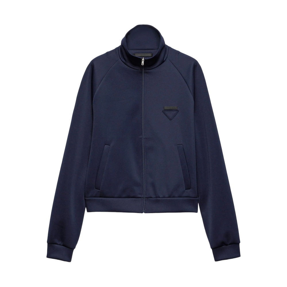 navy blue front zip fastening two side welt pockets triangle logo long sleeves
