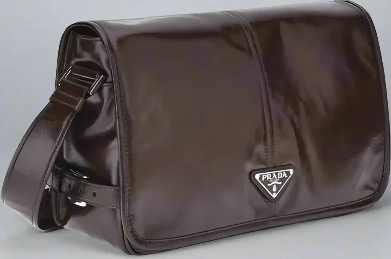 Prada’s Leather Shoulder Bag features a sleek patent-leather design enhanced by an adjustable flat strap for optimal comfort. The front magnetic flap closure opens to a double interior compartment, while a zippered welt pocket on the back offers additional convenience. The distinctive touch is the brand’s iconic three-dimensional, enameled plaque applied to the front, giving the model an unmistakable style signature.