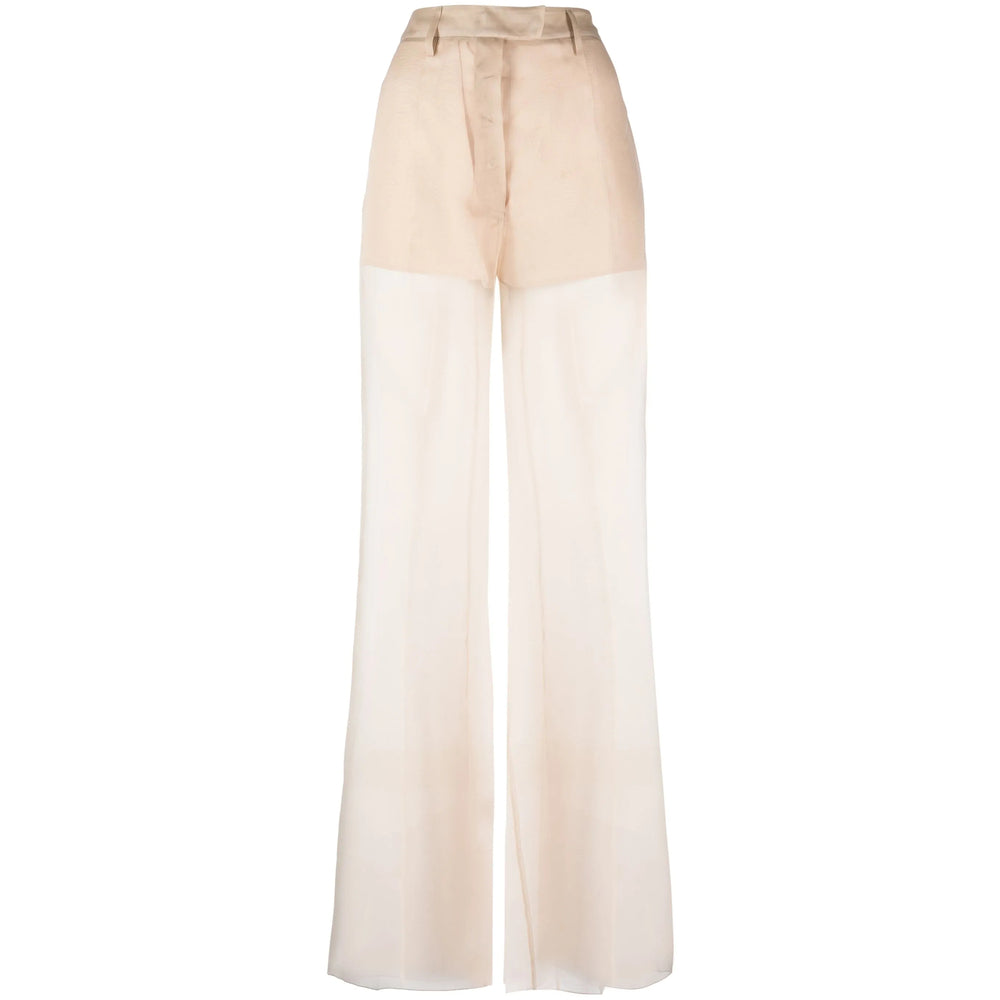light beige silk organza panels sheer pressed crease belt loops concealed front fastening flared design