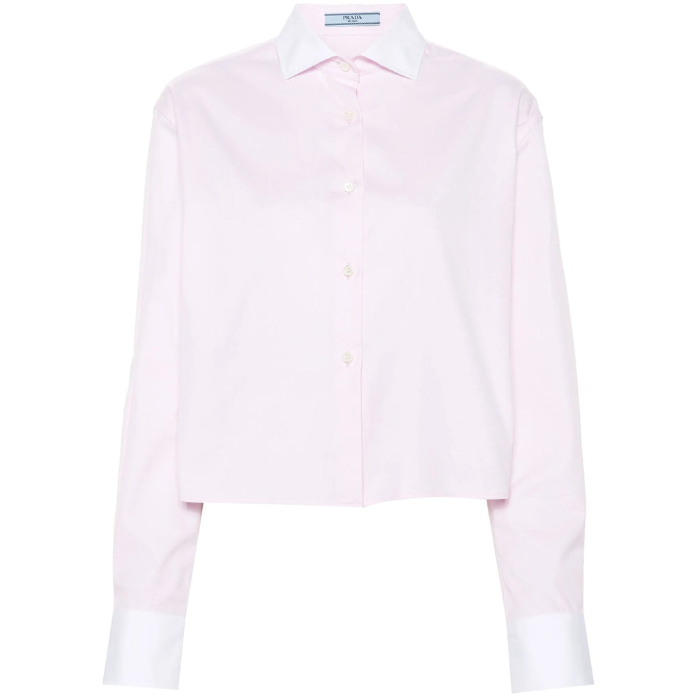 pink cotton textured finish contrasting collar long sleeves buttoned cuffs embroidered logo to the side triangle logo straight hem front button fastening