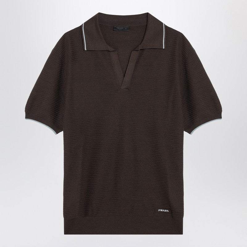 Short-sleeved polo by Prada in a brown ebony silk and cotton blend, open collar with contrasting edge, V-neck, zigzag pattern, and front logo embroidery. Model wears size 50 IT Model measurements: Height: 187 cm Chest: 102 cm Waist: 76 cm Hips: 92 cm