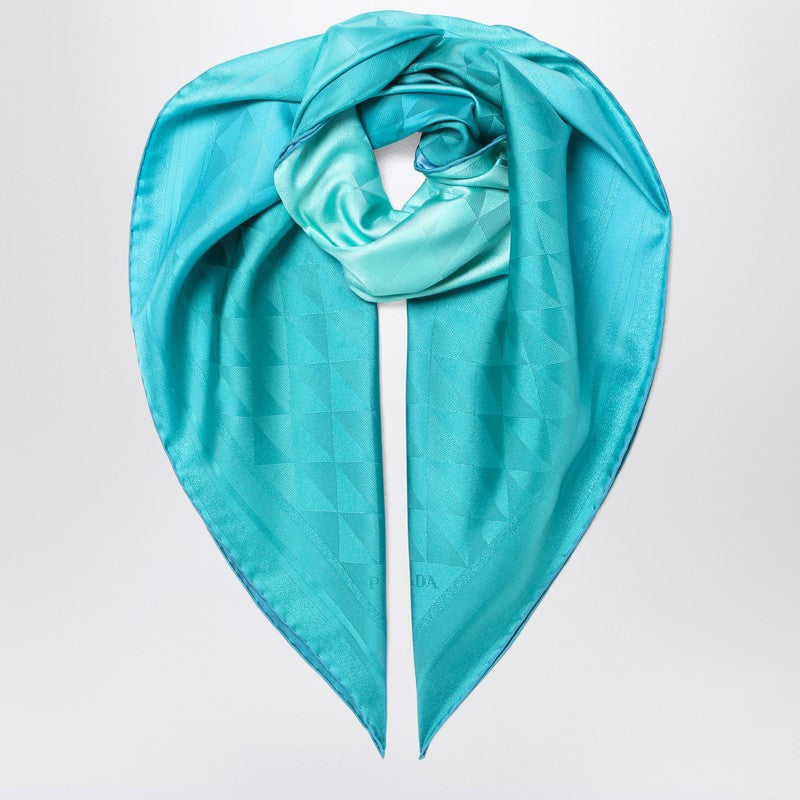 Prada foulard in recycled polyester twill in gradient turquoise, characterized by a degradé symbol print and tone-on-tone logo lettering on the corner.