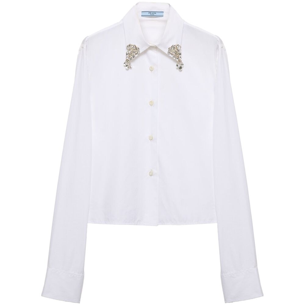 white cotton poplin texture front button fastening straight-point collar crystal embellishment long sleeves buttoned cuffs triangle logo to the rear straight hem