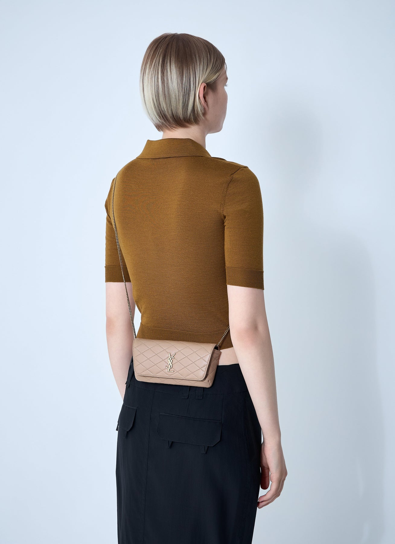 Woman in designer skirt and holding white box purse