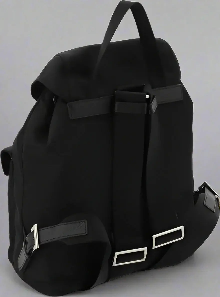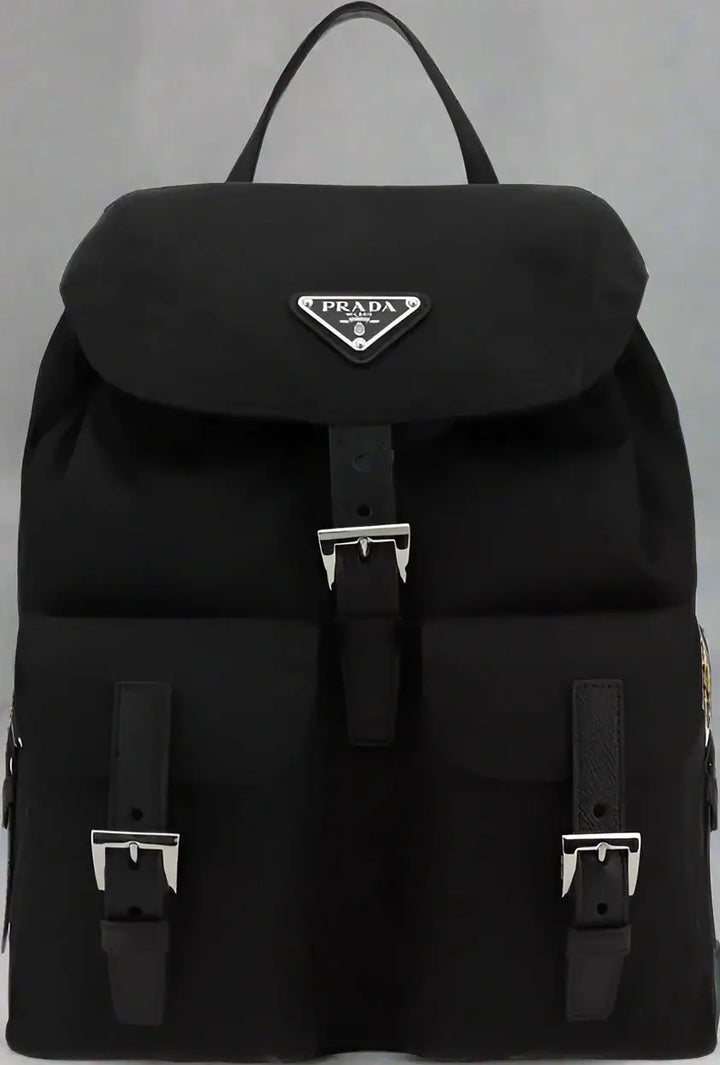 Re-Nylon Backpack by Prada, two front patch pockets with snap button closure and adjustable buckles, brand’s iconic enameled triangular plaque applied to front, top closure by drawstring and magnetic flap, adjustable shoulder straps at back.