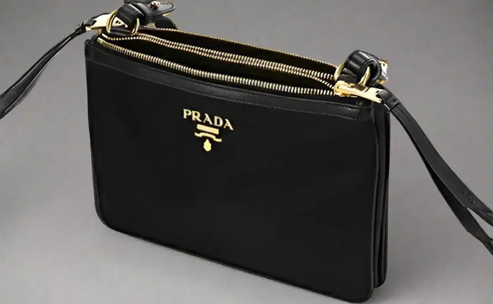 This PRADA women's black Small Crossbody Bag features a sleek nylon design with a gold-tone logo and a detachable shoulder strap. Compact yet practical, it measures 18 cm high, 24 cm long, and 3 cm wide, perfect for everyday essentials. Secure your style with its top zip closure. Made in Romania for quality you can trust.
