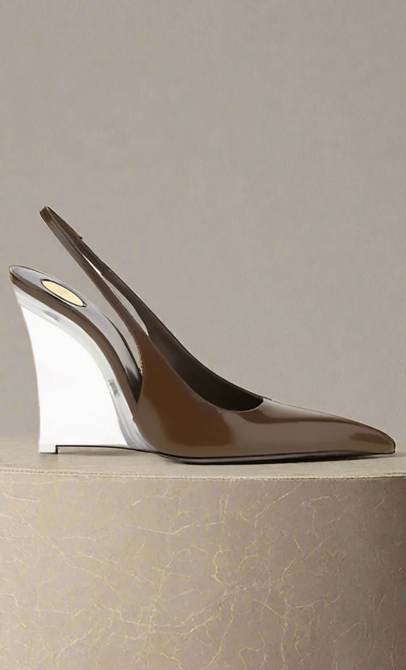 The shiny leather Miller Pumps by Saint Laurent express bold, contemporary elegance. Featuring a sleek silhouette with an elongated toe and an elasticized slingback strap, they combine comfort and style. The transparent wedge heel gives an unexpected and modern touch, while the logoed insole completes the design with the Maison’s unmistakable signature. A striking model, perfect for elevating any look with personality.