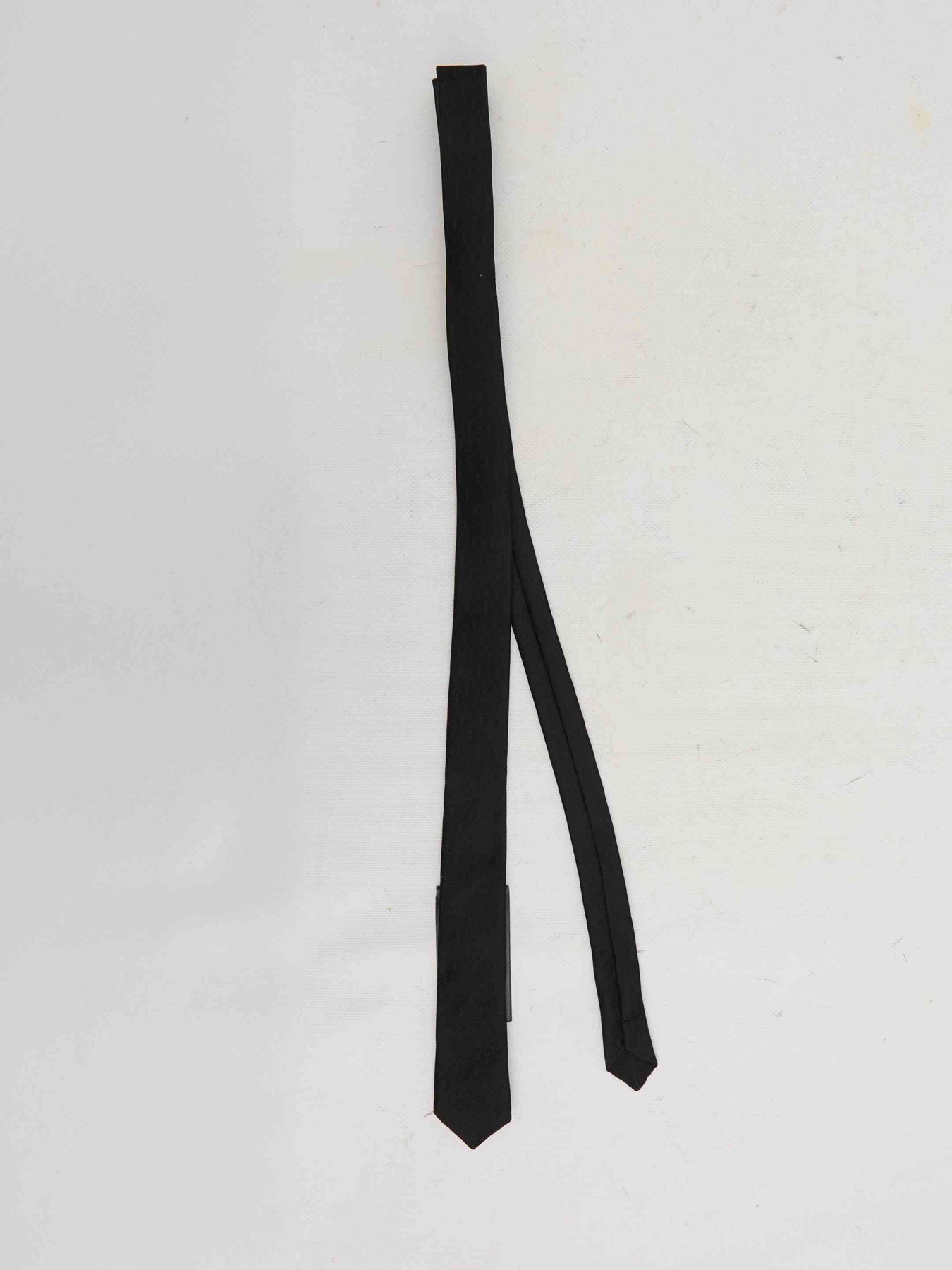 Slim black silk tie with tonal Cassandre monogram pattern and logo label on the back.