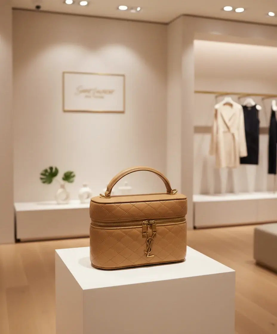 The Vanity Gaby leather Handbag by Saint Laurent combines elegance and practicality in a compact and refined design. Featuring an all-over quilted finish, it features a flat top handle, a double-slider twist closure, and an adjustable and removable flat shoulder strap. The distinctive touch is the three-dimensional plaque with the iconic YSL logo on the front panel.