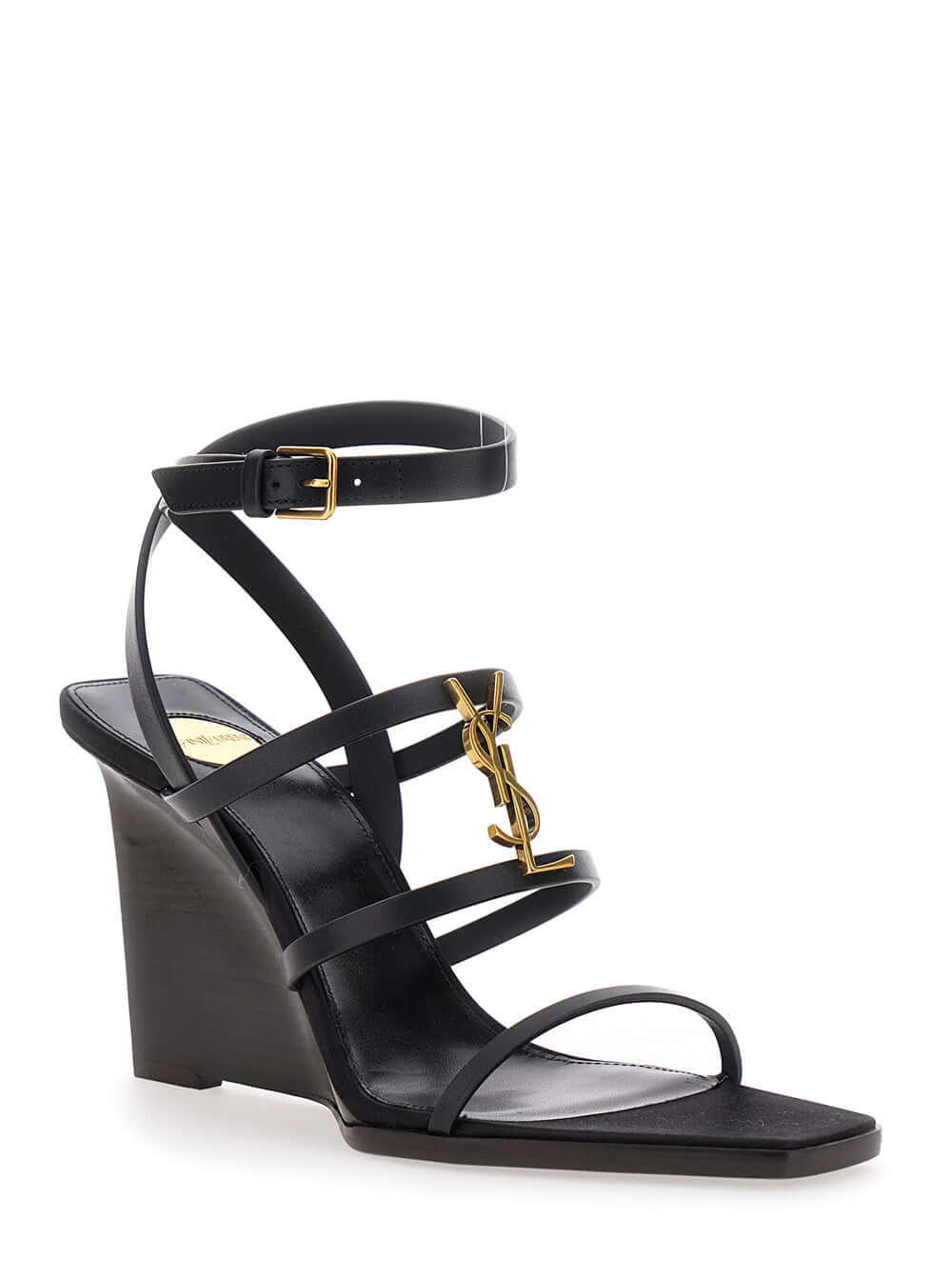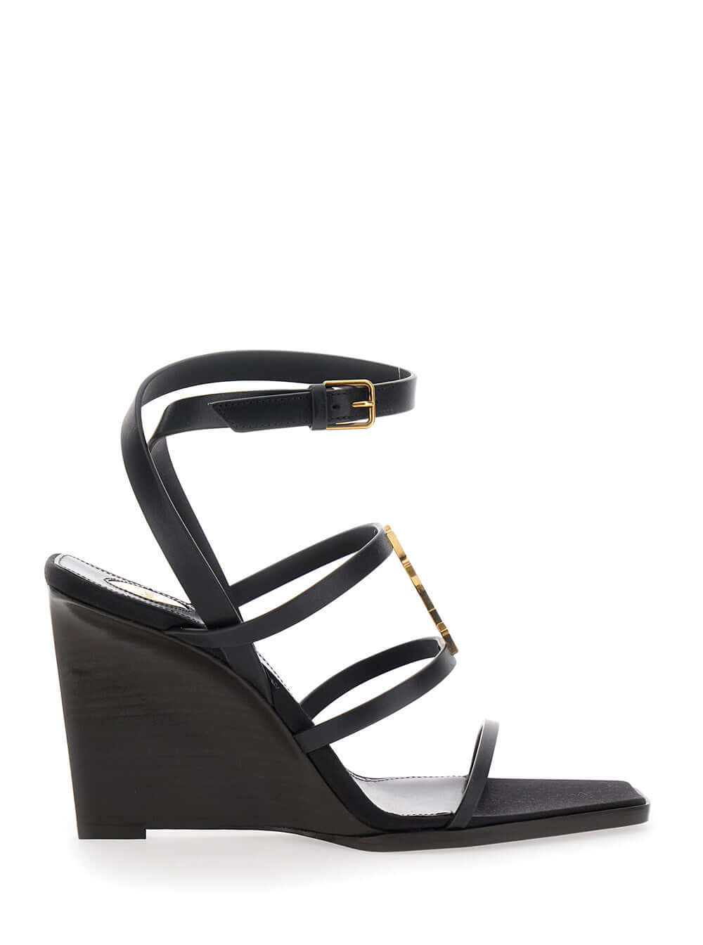 Saint Laurent Women Black Wedges With Metallic Cassandre Detail And Adjustable Leather Strap In Leather Women