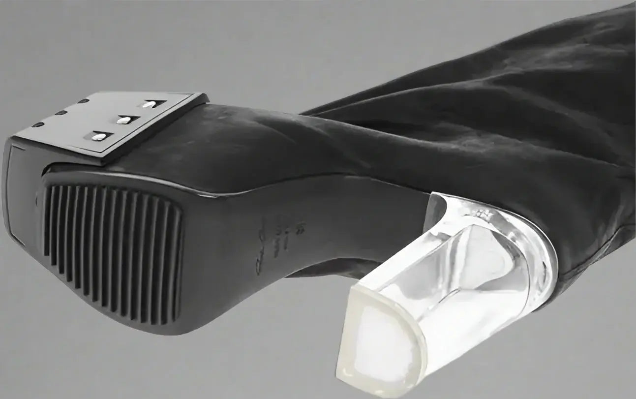 Elevate your style with these striking Rick Owens Spring-Summer black leather boots. Masterfully crafted in Italy, these over-the-knee stunners feature a bold 12cm Plexiglas heel complemented by an 8cm platform for dramatic height with surprising stability. The square toeline adds contemporary edge, while the generous 15cm leg width ensures comfortable fit. Part of the exclusive WOMEN'S DAY collection (P640471), these premium leather boots deliver the perfect blend of avant-garde design and luxurious craftsmanship that discerning fashion enthusiasts demand.