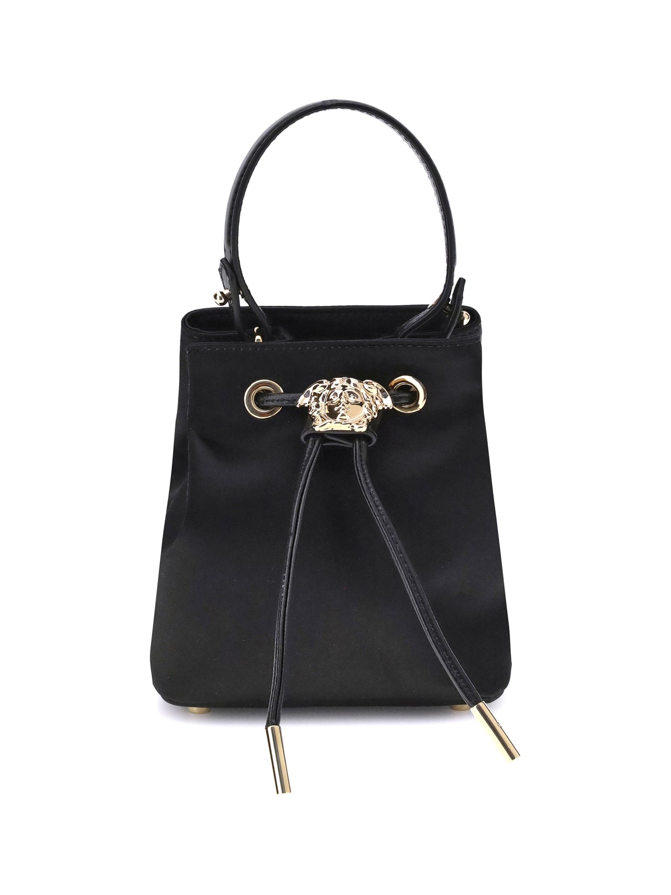 The Versace La Medusa Bucket Bag, crafted from satin with a shiny satin finish, is an elegant and distinctive accessory. Featuring the iconic three-dimensional emblem on the leather drawstring closure, it features a removable handle and a removable chain shoulder strap, allowing it to be worn comfortably cross-body for a versatile and refined look.