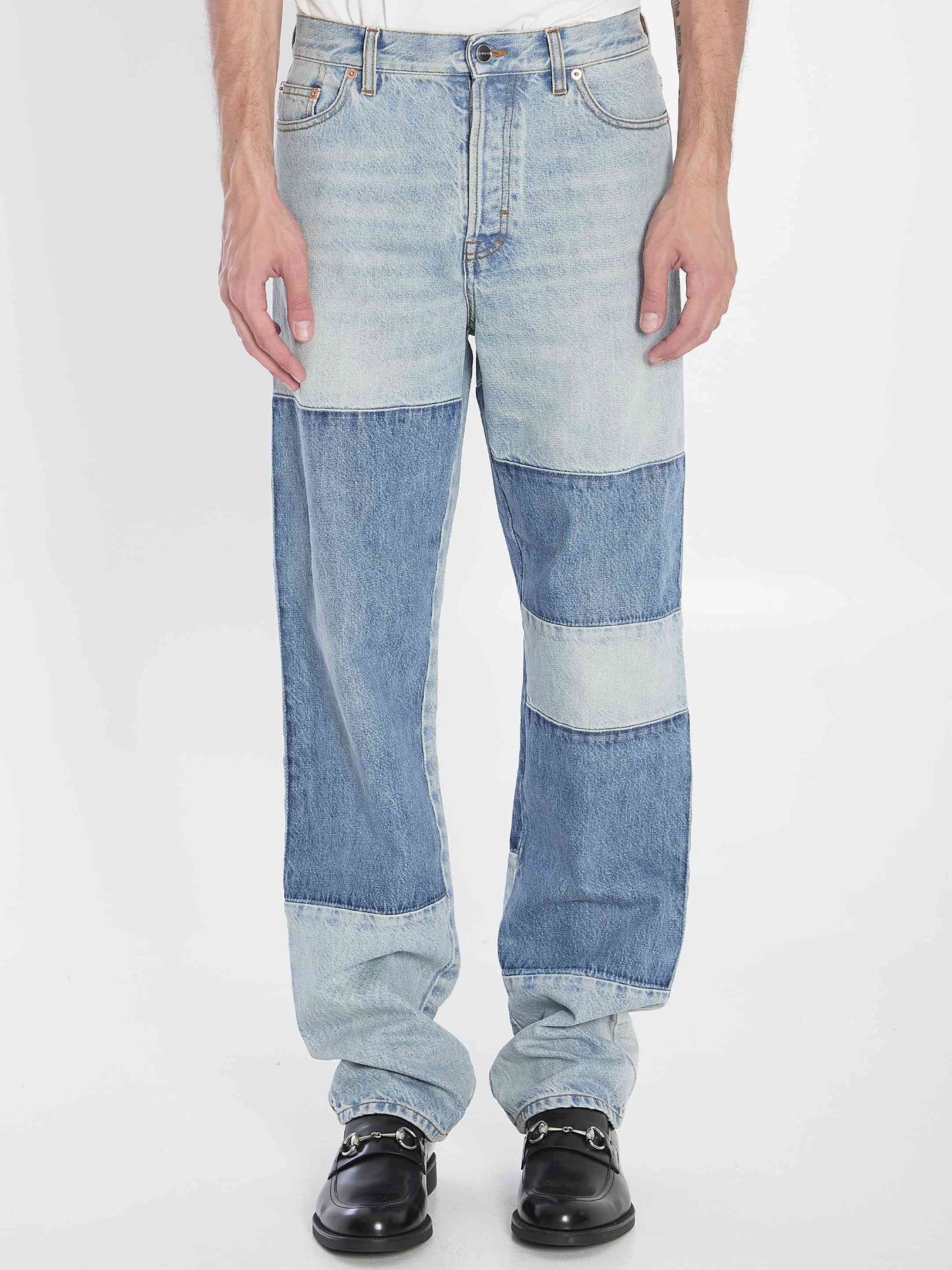 Denim Pants featuring a patchwork design with contrast inserts. They come with multiple pockets and a front button and zip closure.
