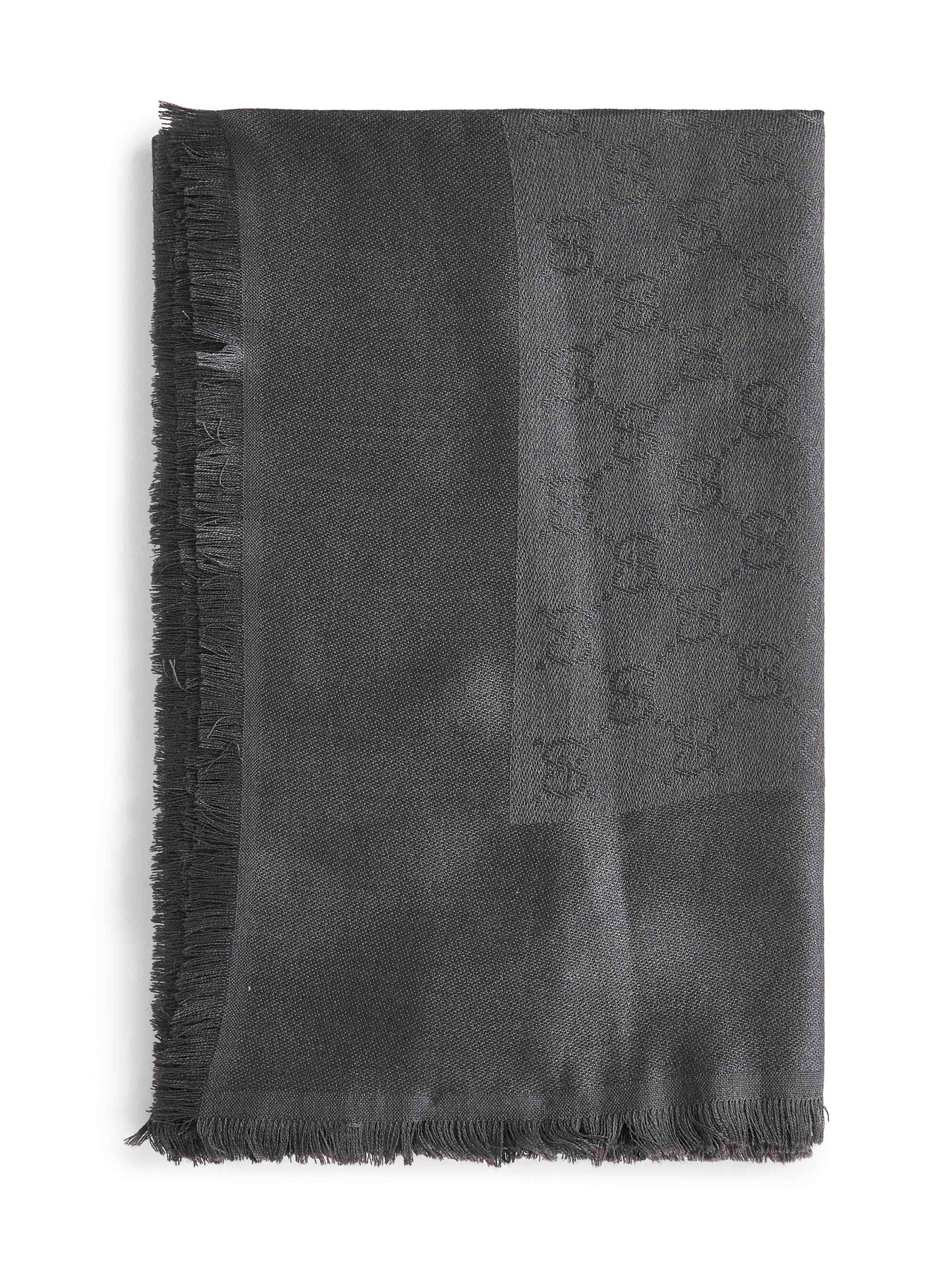 •Square model •Thin fringes trim at ends •Tone-on-tone jacquard GG motif •120 X 120 cm •Grey color •70% Wool, 30% Silk •Made in Italy