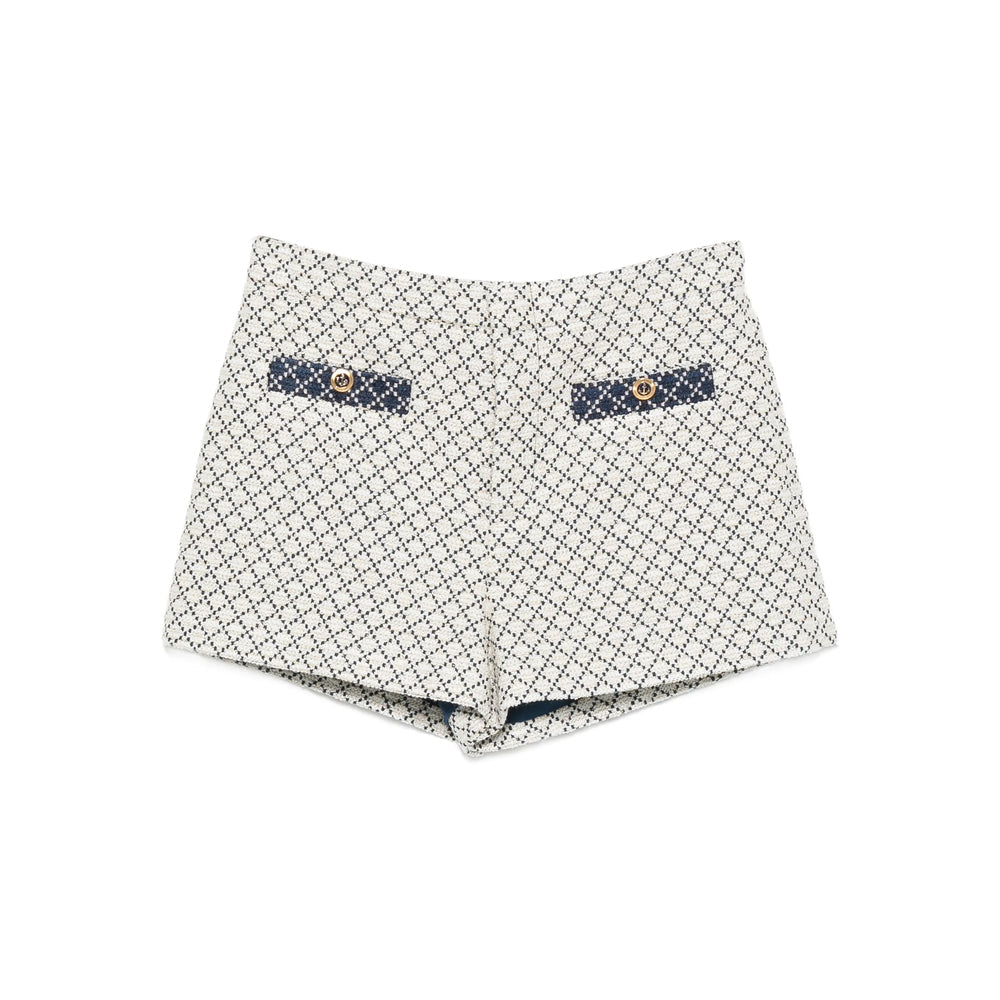 beige geometric pattern navy blue pocket trim gold button embellishment high waist straight hem