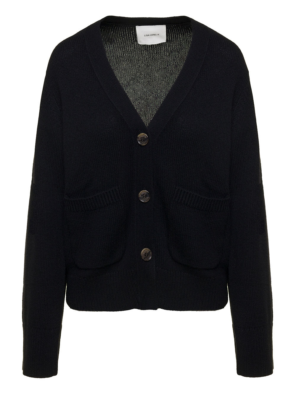 Cardigan Black V-neck Long sleeves Front button closure Two front pockets Ribbed hem and cuffs Cashmere Oversize fit