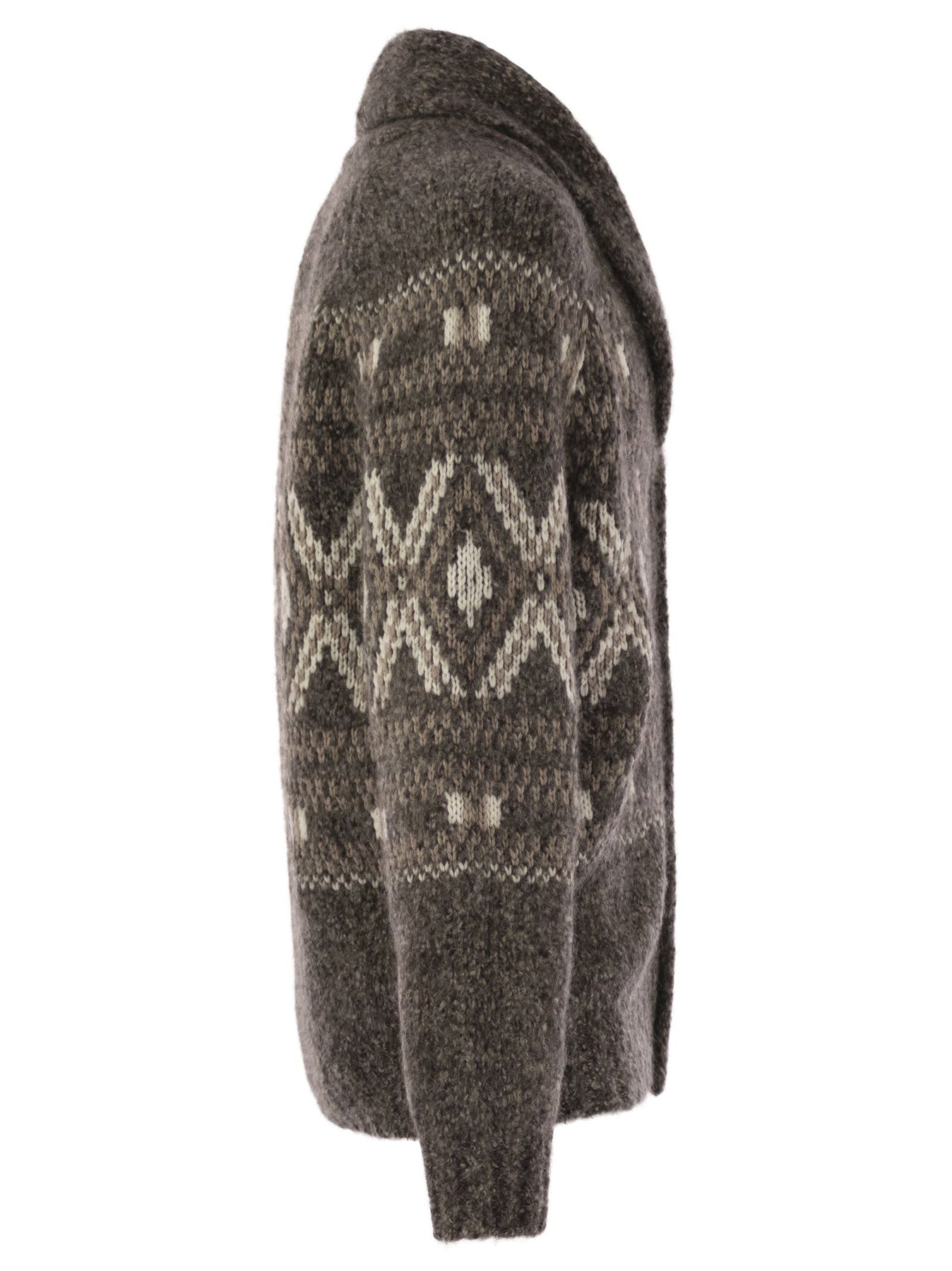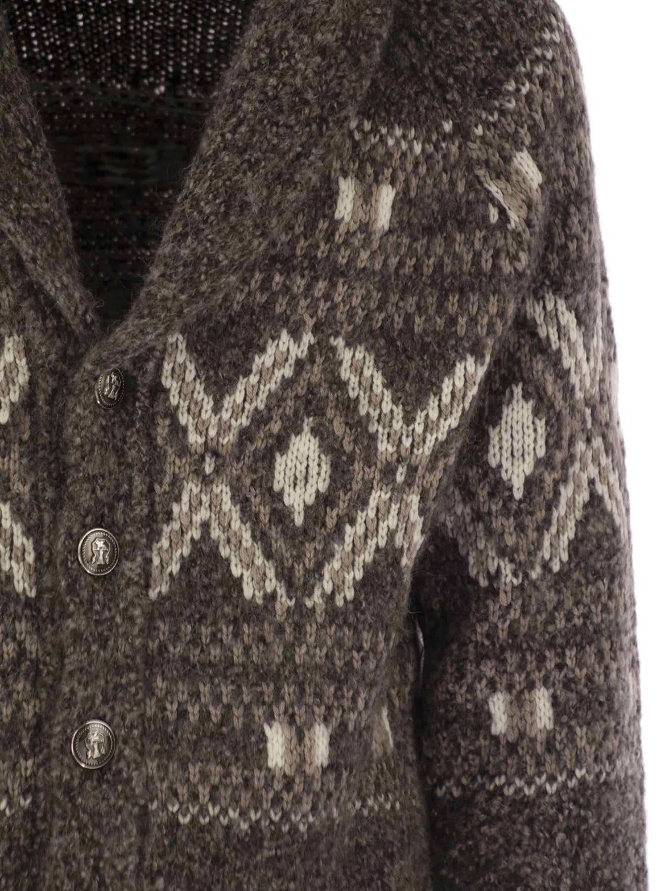 Brunello Cucinelli Men Geometric Jacquard Cardigan In Alpaca, Virgin Wool And Cashmere With Metal Buttons