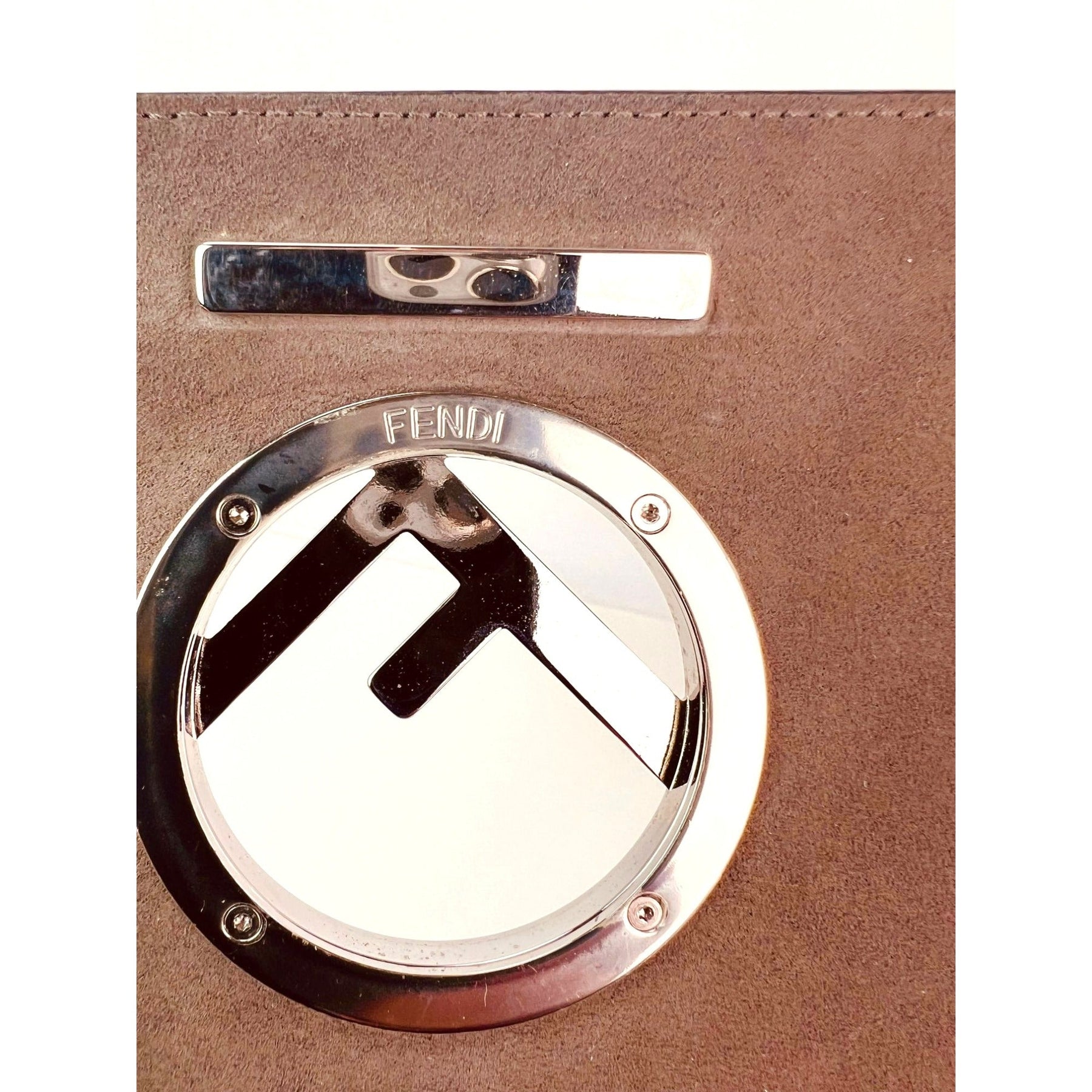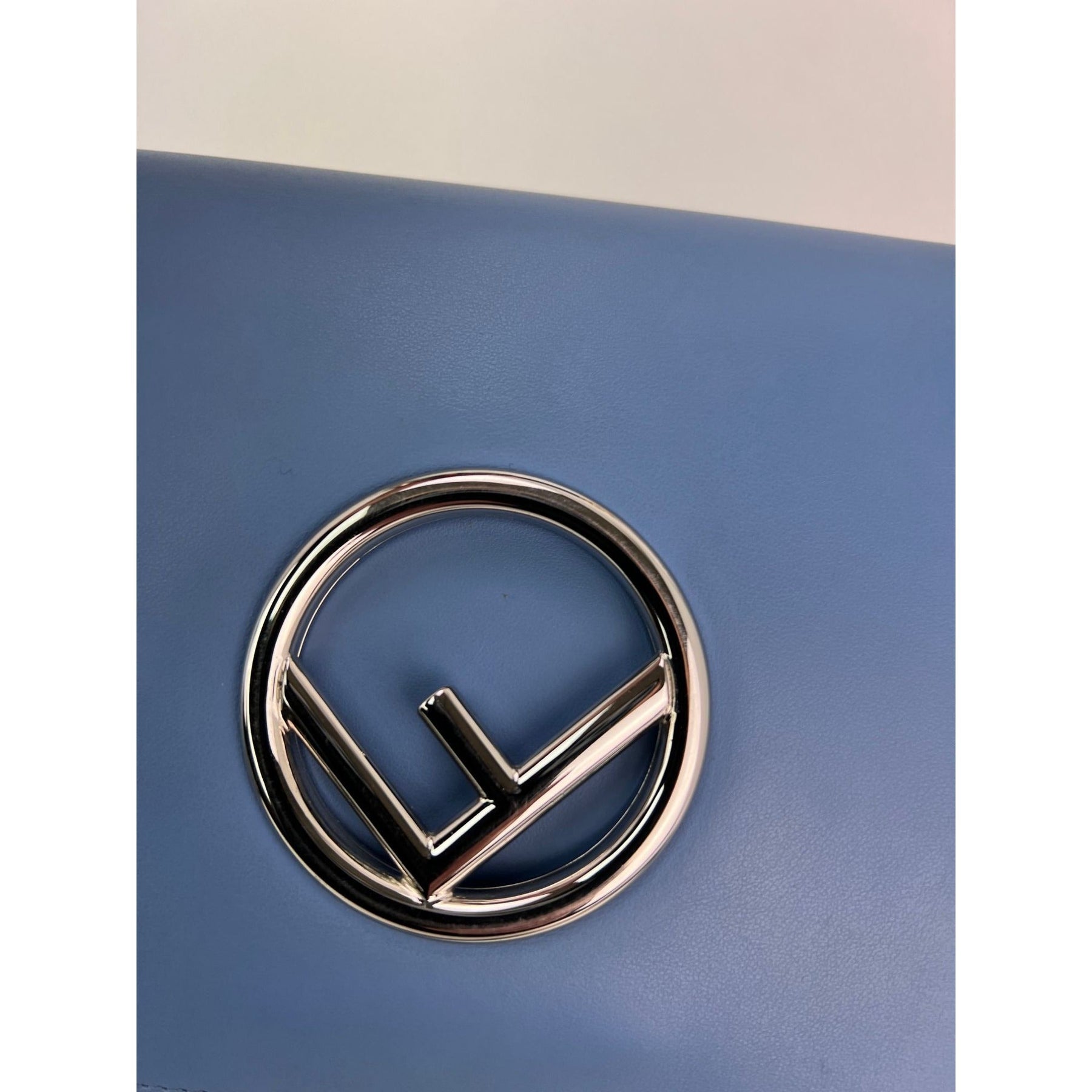 Close-up of Fendi logo on the Fendi F Kan 1 Medium Blue Leather Shoulder Hand Bag, a luxury bag. >