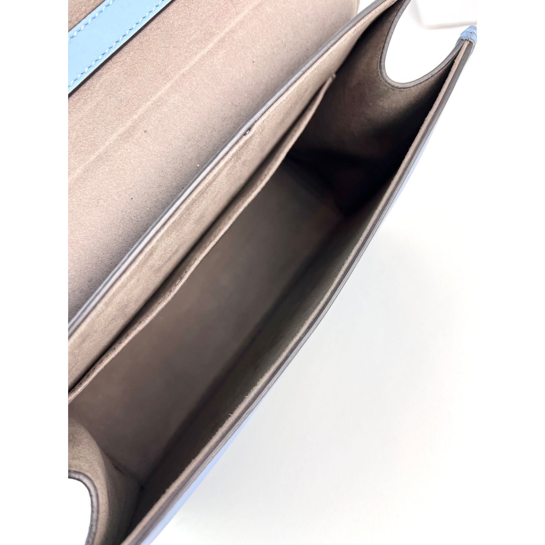 Interior view of the Fendi F Kan 1 Medium Blue Leather Shoulder Hand Bag showcasing compartments and soft lining. >