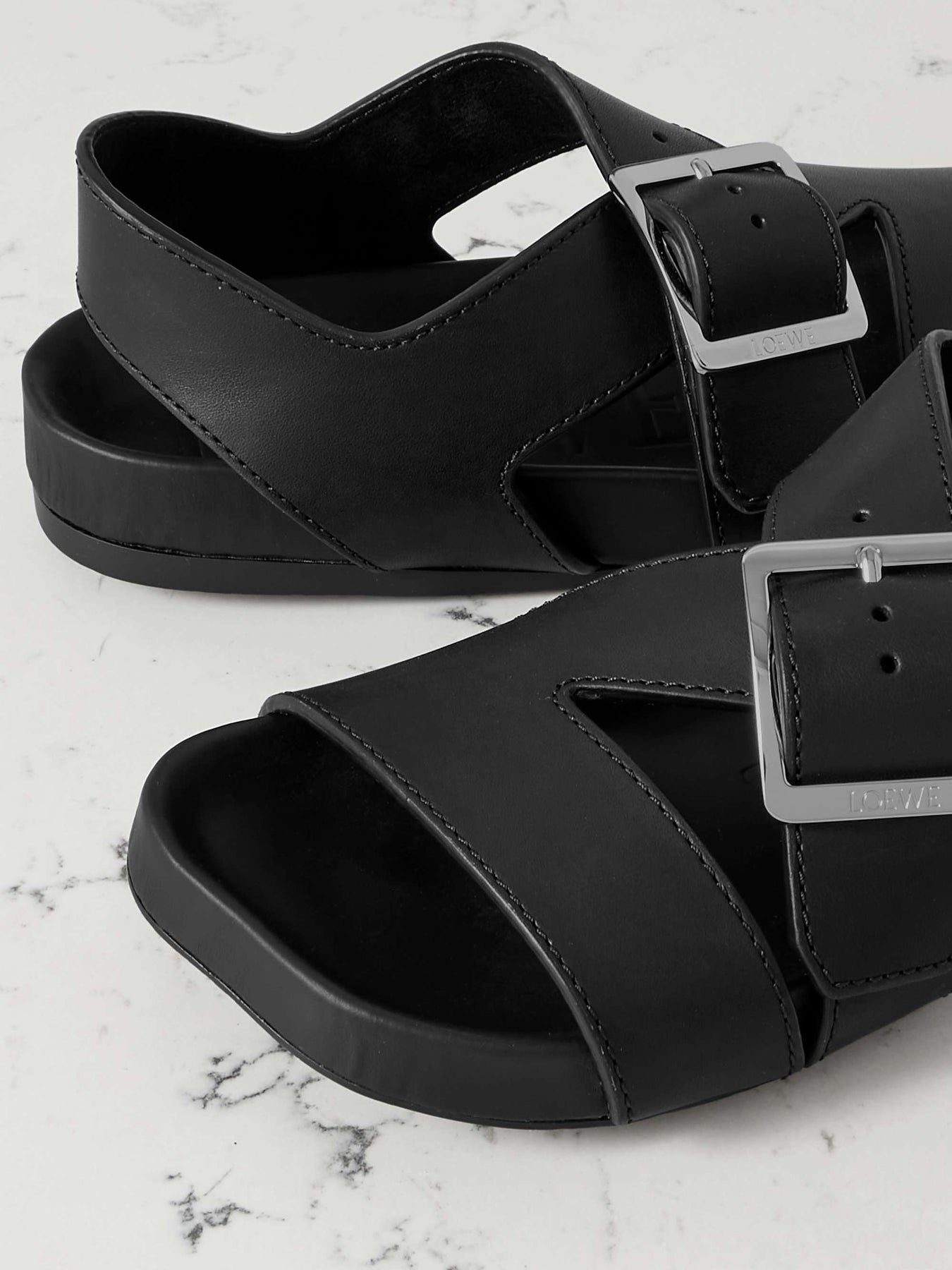 black calf leather square open toe crossover strap at the toe branded leather insole rubber sole silver-tone hardware side buckle fastening with logo-engraved buckle